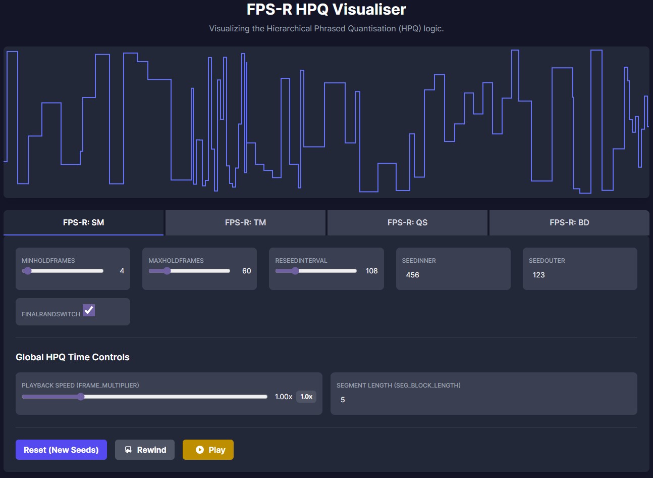 The QS algorithm is the second most expressive algorithm in the FPS-R framework; able to produce a wide range of phrasing patterns and the strongest contrast between short bursts of stuttering or glitching and long periods of holding. QS has the highest number of parameters.